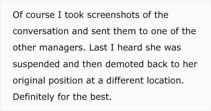 This didn’t sit well with the OP and she sent over the screenshots of their conversation to one of the other managers. The most satisfying part is that the rude new manager got demoted and was sent to work in a different location.