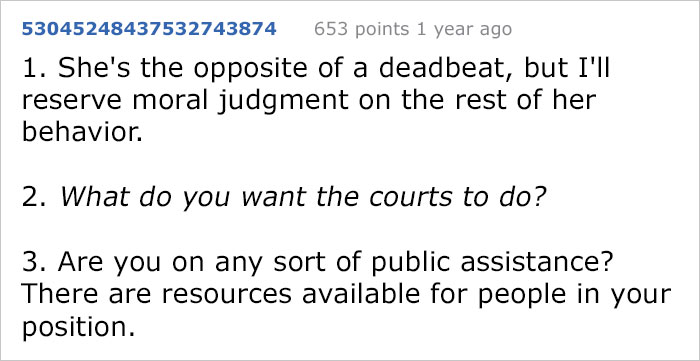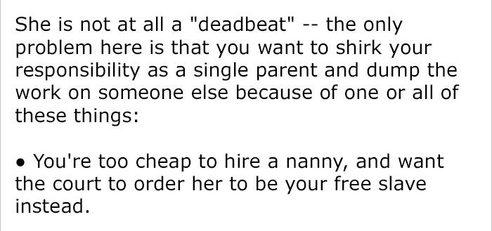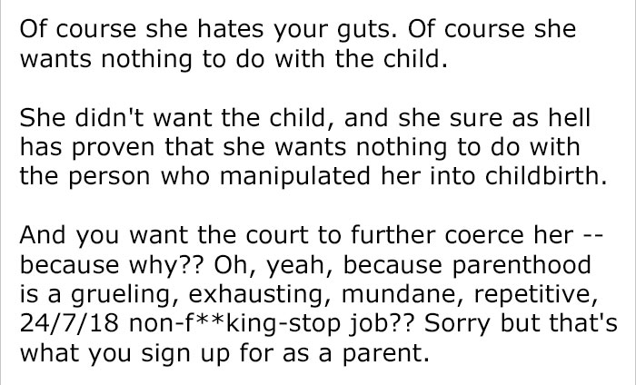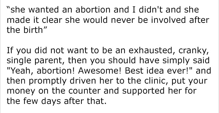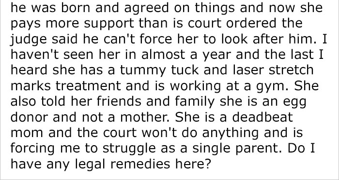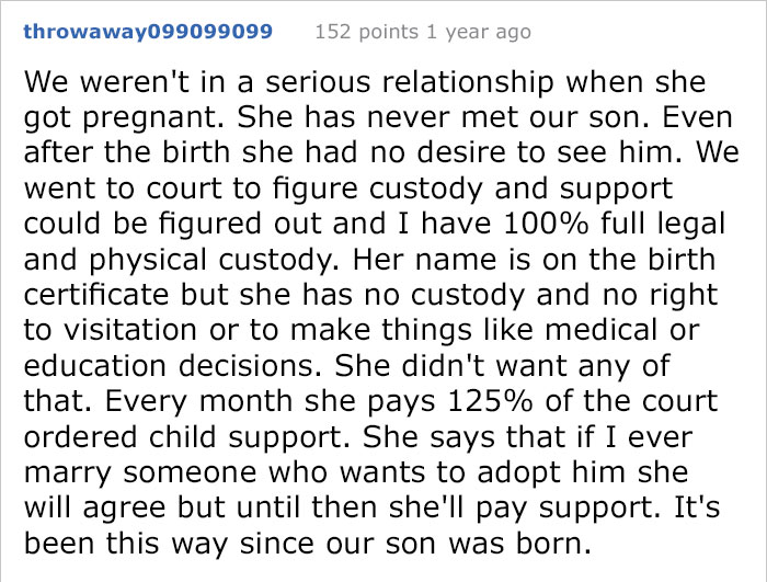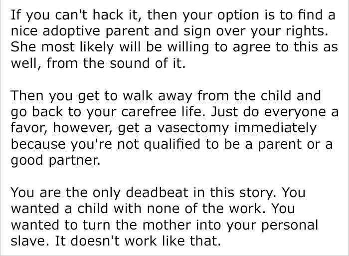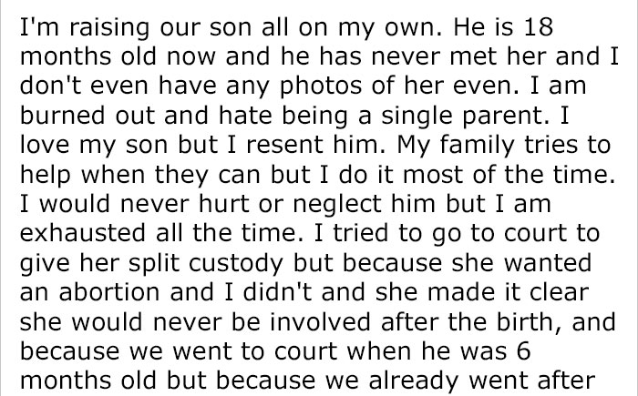 Parenting can definitely be a challenge, but some people find itmore difficult than the other, especially when the child is still just a mere baby. From changing diapers to many sleepless nights, the trials and tribulations of being a parent can truly take a tollon any person. And that becomes even harder when you’re a single parent. Tired of raising his 18-month-old son, one single dad decided to share his troubles with Reddit, seeking legal advice on making the mother of his son take care of the child. He explained the situation, focusing on his ex-girlfriend and the choices they both made, passing judgment and calling the woman a “deadbeat mom”. Although he asked for legal advice, the man got more than he bargained for. Scroll down below to read the full story and don’t forget to tell us what you think! (Facebook cover image: julie corsi)