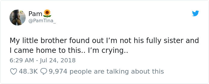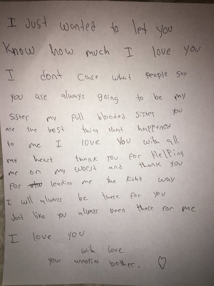 Twitter user Pam’s brother recently got the news that his beloved sister is not actually a ‘fully sister,’ and it upset him quite a lot. So he decided to pen a heartfelt and completely adorable letter to her, which he presented to her along with some gifts to show his love.