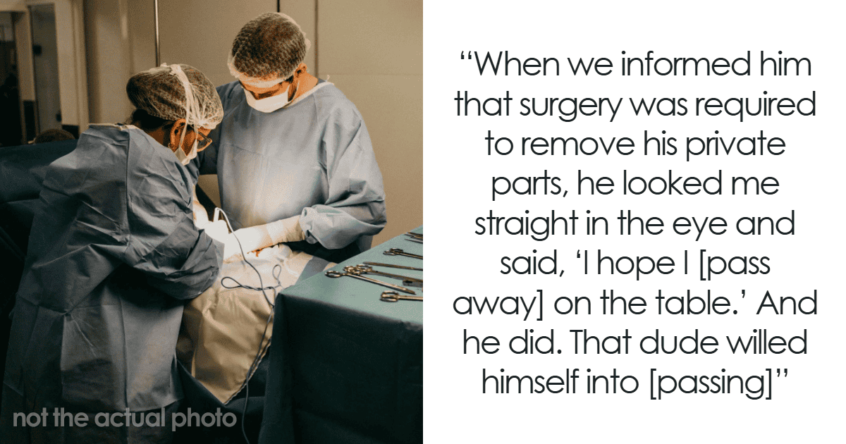 Man, I’ll never forget this guy. He was a diabetic, 52 years old, came in with gangrene of the testicles. When we informed him that surgery was required to remove his private parts, he looked me straight in the eye and said, “I hope I d** on the table.”
