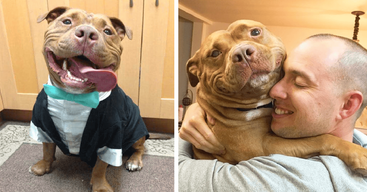 The pitbull dog hasn’t stopped smiling since being adopted.