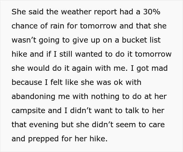 OP also shared that the hike that their girlfriend was planning isn’t meant to be done in one day and that a park ranger advised her against it. However, the woman was pretty confident in herself and her abilities, so she decided to go alone. This didn’t sit well with her partner who asked her whether they could do it the next day after they recovered, but the woman had already made up her mind, saying that she didn’t want to risk having bad weather the next day, so she would go on the day she planned to do it originally. She even said that she could repeat the hike one more time if her partner wanted to do it after they recovered.