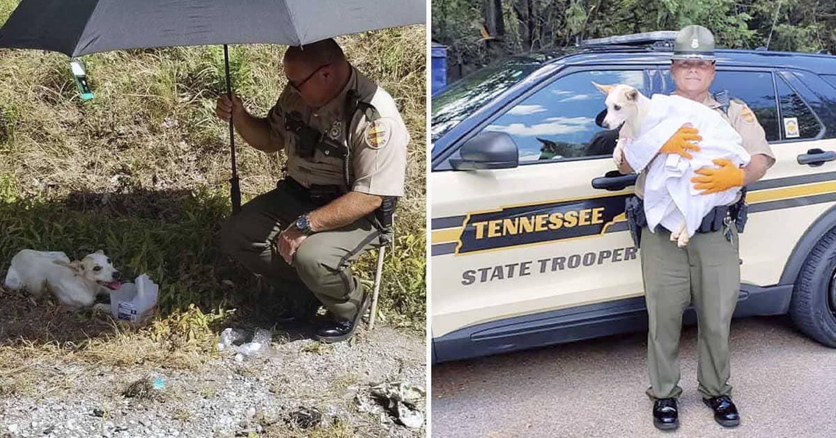 Kaye Fiorello was driving her car on Interstate 75 in Cleveland, Tennessee, when she observed a puppy stuck on the side of the road, wandering in fear in the heat, and she quickly called highway police for assistance. The Tudors patrolman arrived quickly to carry the dog to safety.
