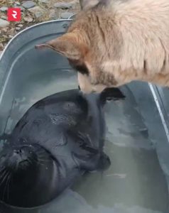 To make the baby gain strength faster, people began to feed him with sliced fish. But it turned out that by nature seals eat in the water, so the baby was launched into the bath. At the same time, the dog did not move a step away from its ward. After a while, the seal was able to get out of the bath and crawled to Nicka.