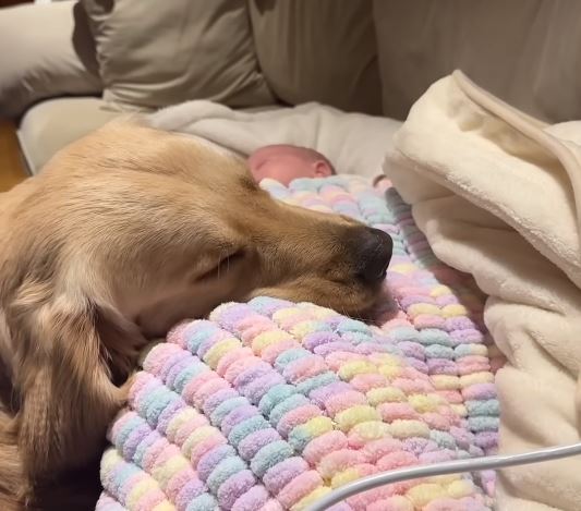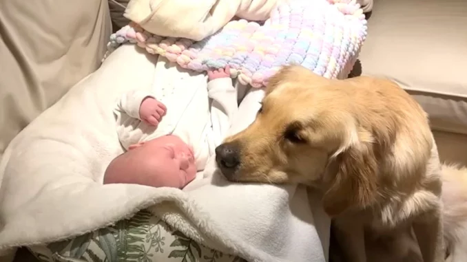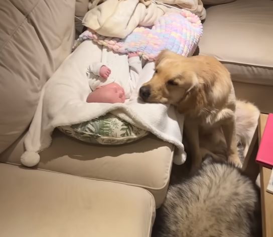 In the video they recently shared on YouTube, Buddy is always sitting next to the newborn baby, sometimes even sleeping right next to him, with his snout on the baby’s legs.
