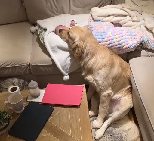 Just like the Golden Retriever in this video, who has just met his new human brother.