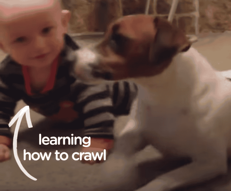Dogs are also amazing teachers. This helpful pooch is showing his human sibling how to crawl! It won’t be long until these two are running around and playing hide-and-seek together.