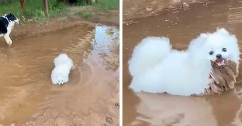Mom Looks On In Shock As Her Newly Groomed Pup Finds A Big, Muddy Puddle