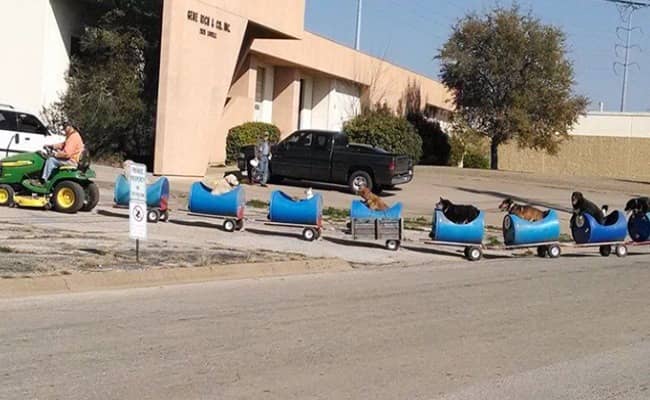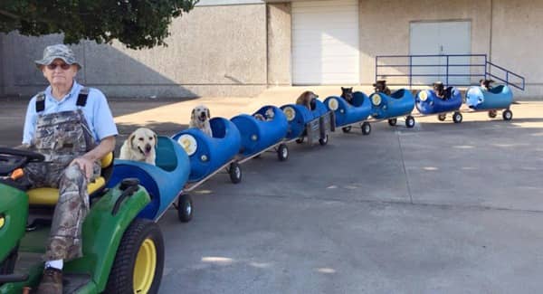 Shortly after his retirement, he built his very own train to take stray dogs on small adventures around the neighbourhood and surrounding woods. He lives in neighborhood in Texas a street where people come to abandon their dogs. The dogs were left to fend for themselves.