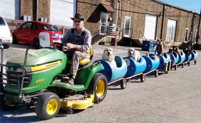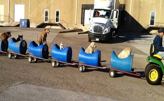 “One day I was out and I seen this guy with a tractor who attached these carts to pull rocks. I thought, ‘Dang, that would do for a dog train. I’m a pretty good welder, so I took these plastic barrels with holes cut in them, and put wheels under them and tied them together. I started out with my tractor… I’d put 4-5 dogs in there and take them riding. All of a sudden, a couple more dogs showed up. I said, ‘Oh, that’s not enough room’ – and that’s when I came up with THAT. Whenever these adorable dogs hear me hooking the tractor up to it, man, they get so excited.” he said