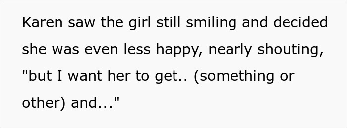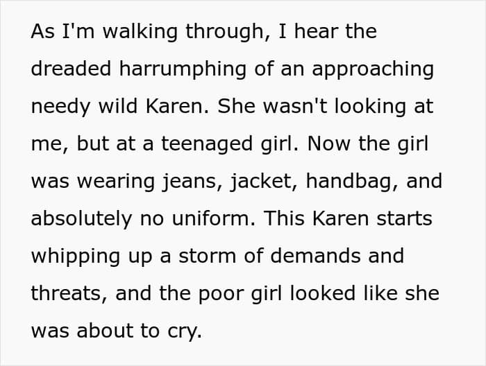 At one fine moment, the author of the post noticed a completely typical livid “Karen”, who chose a random teenage girl as the target of her anger. It is not clear why she became this very target – after all, the girl was not wearing a uniform, and most likely was just another customer, but when did such a little thing stop any truly entitled person?