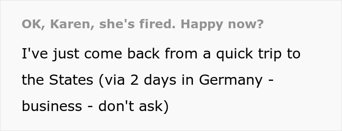 The legend, literally with a wave of his hand, stopped the stormy flow of indignation from Karen and, turning to the upset girl, imperiously declared: “I’m officially promoting you to customer. You’re fired. Enjoy your shopping experience!” The teen, as the OP recalls, couldn’t stop grinning by this point, and the guy in the suit, continuing his inspirational speech, turned to Karen again: “She’s fired. Happy now?”