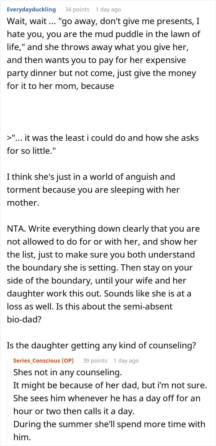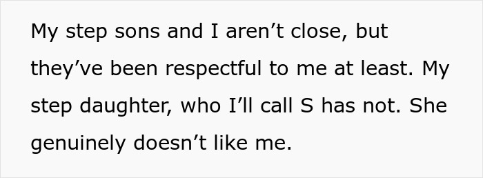 So, the Original poster (OP) is married to a woman who has three children from a previous marriage. And the older sons, 20 and 19 years old, although not close to their stepfather, at least treat him with due respect. But not his 16 Y.O. stepdaughter. No matter how hard the man tried to mend fences, nothing really helped.