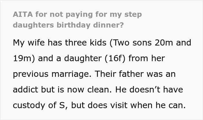 The first problem was that the OP’s wife and other relatives did not have enough money to celebrate the birthday on the scale that the girl wanted. The OP, however, had this money, but the second problem followed from here – she literally demanded that the man give this money to her mom and she arranged the dinner. Oh yeah, one more little touch to the picture – the teen said the stepdad will not be invited to this party!
