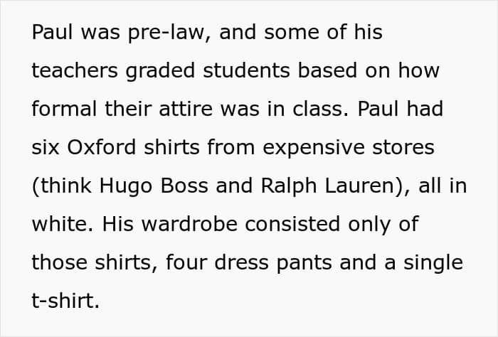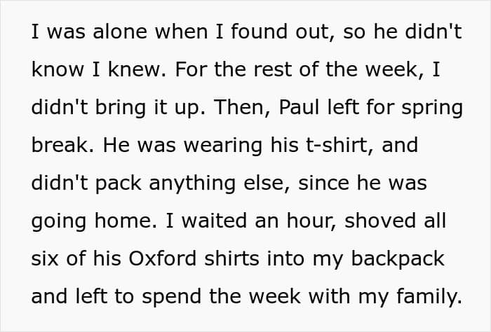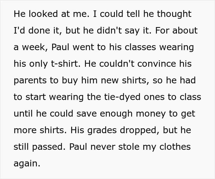 Another commenter by the name of tricularia shared his own clothes-stealing horror roommate story on the original post. Apparently, his roomie was also pre-law or in law school and would also use his clothes, drink his beer, eat his food, and so much more.