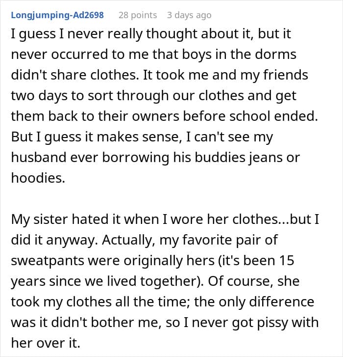 This Reddit story collected 5.6k upvotes and over 150 comments. They cheered OP on for an epic act of revenge and questioned what was going on in the roomie’s head for just taking someone else’s clothes.