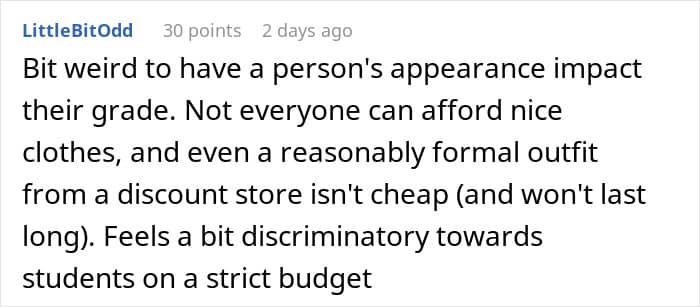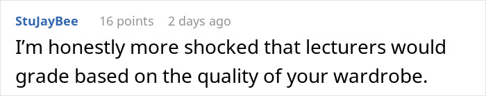I’m unsure what kind of university the poster was studying at, but it’s the first time I’m hearing about dress code requirements for students, even if they are learning law. I thought it was some kind of unspoken rule for students to be as rattily dressed as possible. What’s more important, being comfortable while learning or looking formal?