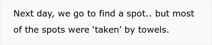 In a move reminiscent of some of the brilliant generals of history, OP utilized the old wisdom of “divide and conquer,” removing all the towels, and pitting the hordes of vacation-goers against each other. Her petty revenge was clever enough as is, but a brilliant part that might go overlooked is making many if not most of the “towel placers” understand the silliness of their idea. Allow me to elaborate, had she just approached a person who did this, they would disregard her argument, as displayed in the story. Even worse, they would be backed up by the many other “towel placers,” who would want to keep doing it.