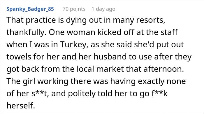 Instead, she let them draw their own conclusions in the ensuing chaos and the hotel intervened to prevent any more arguments. This is the best-case scenario in these sorts of situations. The comments give many other examples of places where common areas end up monopolized by people who think they are entitled to reserve space at their own leisure. This way, the hotel stops “towel reservations” in its tracks. While many shared their own examples of all the different things people called dibs on, it’s comforting to know that more and more locations are putting together rules to prevent these situations from arising. From a purely selfish perspective, it’s good for hotels and resorts as well, as staff doesn’t have to waste as much time resolving conflicts.
