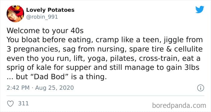 “I’m sorry to tell you that it’s all over after 40! Enjoy your next ten years before you suddenly notice that your back hurts, you’re slightly obsessed with the Weather app on your phone, you feel very grateful for your garden shed, get super-interested in plants, and 9 pm seems like a late bedtime. The worrying thing is, I’m not even joking.” Ariane shared that moving into your 40s is exactly like the memes tell us. There’s very little hyperbole there!