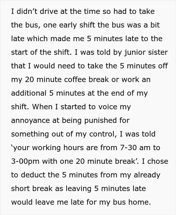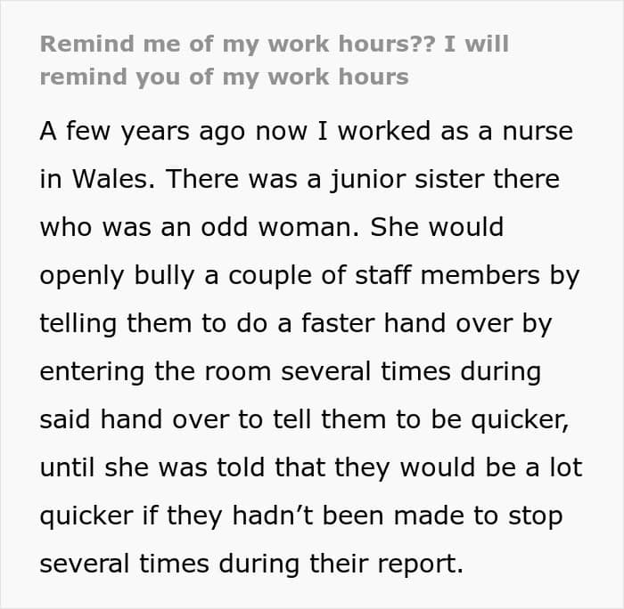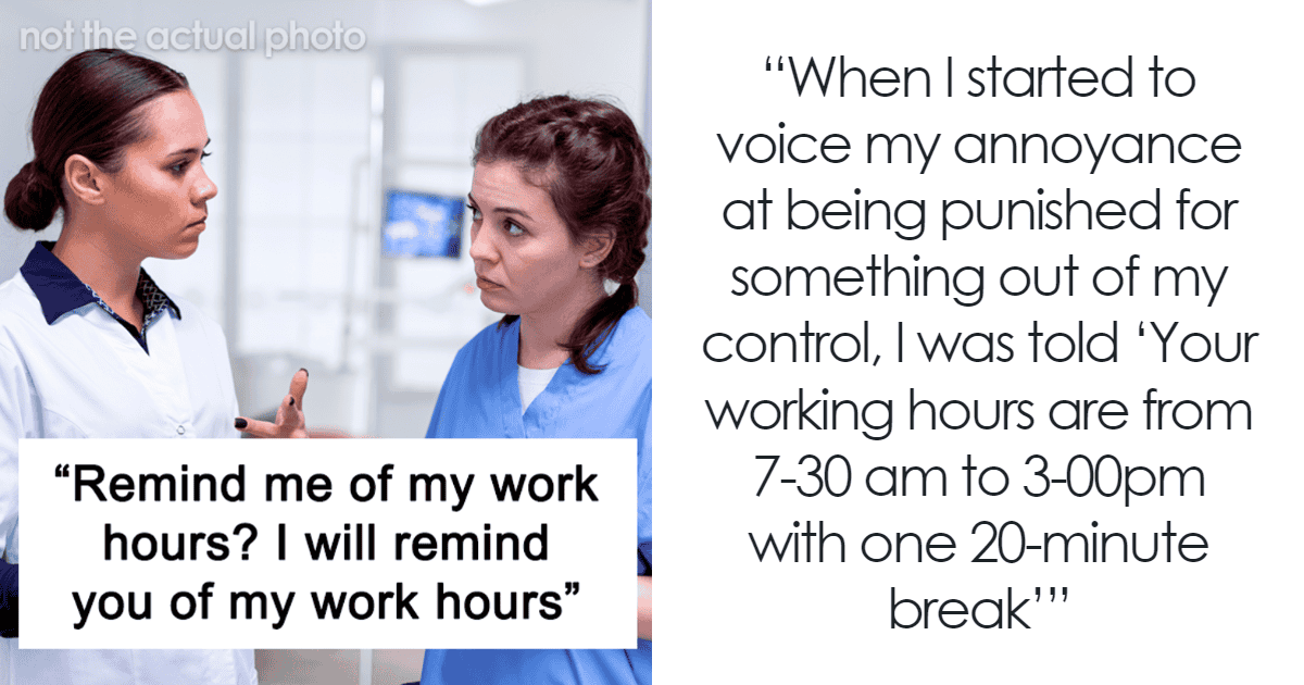 Recently, one nurse shared how she dealt with a manager who was particularly strict about people coming in late. After having five minutes deducted from her already short 20-minute lunch break, the next time the nurse decided to return the pettiness by maliciously complying with the work hours.