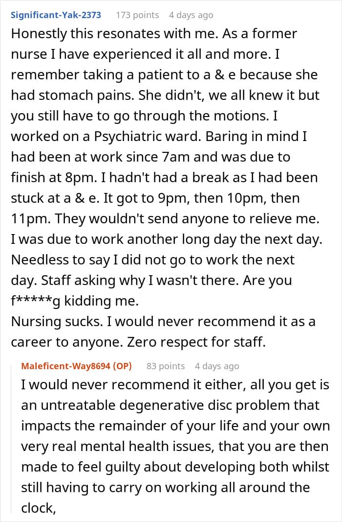 Aside from the first sister’s treatment of her fellow nurses, many people also called out the fact that the author only had 20-minutes lunch breaks. In one of her comments, the author explained other reasons why nursing is so hard and how she wouldn’t recommend it to others.