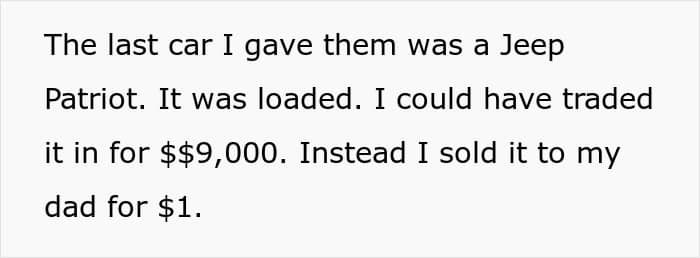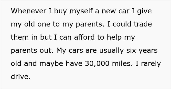 Man gives his cars to his parents when he upgrades, wants them to have a safe ride, they give them to their 30-year-old son to sell for cash as he is jobless
