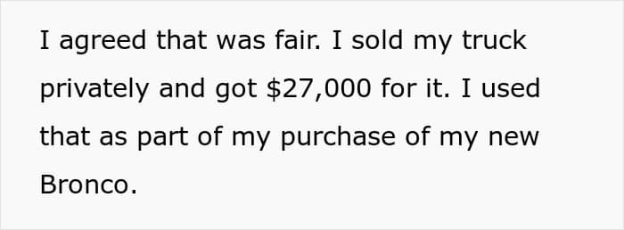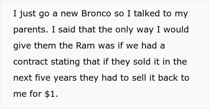 When Alex’s dad saw the Bronco, he naturally asked about the old truck. The response? “I sold it.” So, the parents were stuck driving an old Kia, and they were not at all happy about it. They accused Alex of going back on his word, but he never actually made any promises, only an offer which his folks didn’t accept. He wanted to show his parents that they shouldn’t take advantage of his generosity, by setting boundaries.
