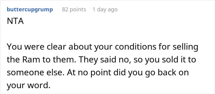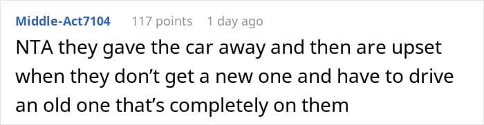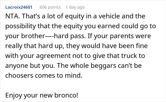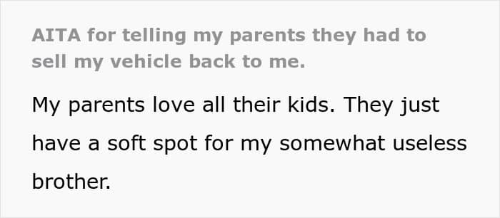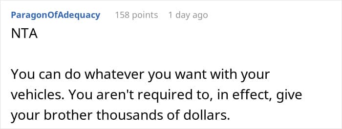 If you want to keep both your wallet and your relationships in good shape, setting clear boundaries and sticking to them is the way to go. And Alex did just that when he offered his car to his parents with the condition that they couldn’t sell it for at least five years. He wanted to make sure they had a safe ride and stop them from enabling his 30-year-old, fully-capable brother.