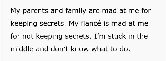 On the flip side, the redditor’s partner is disappointed that she wasn’t able to keep his secret. “I’m stuck in the middle and don’t know what to do,” she wrote.