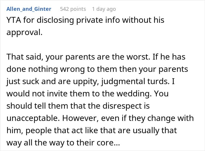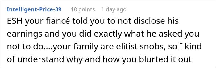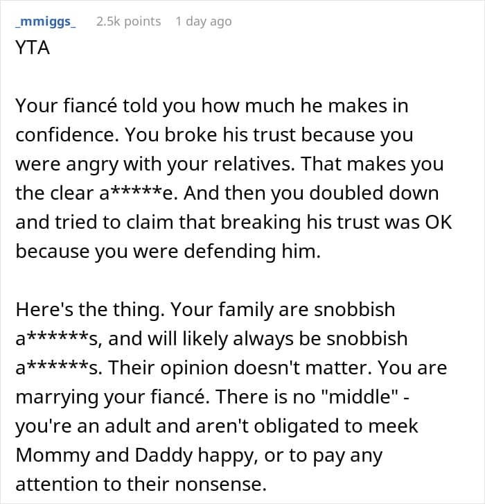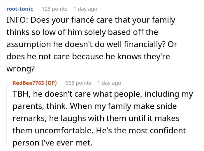 Unfortunately, some parents put too much emphasis on their kids finding someone who earns a lot, instead of a person with good principles and a kind heart. Redditor u/RedBee7763 recently went viral after opening up about how her family looked down on her fiancé when they thought he didn’t earn much. However, she let the secret about his true finances slip one day and turned to the AITA community for advice on what to do next.
