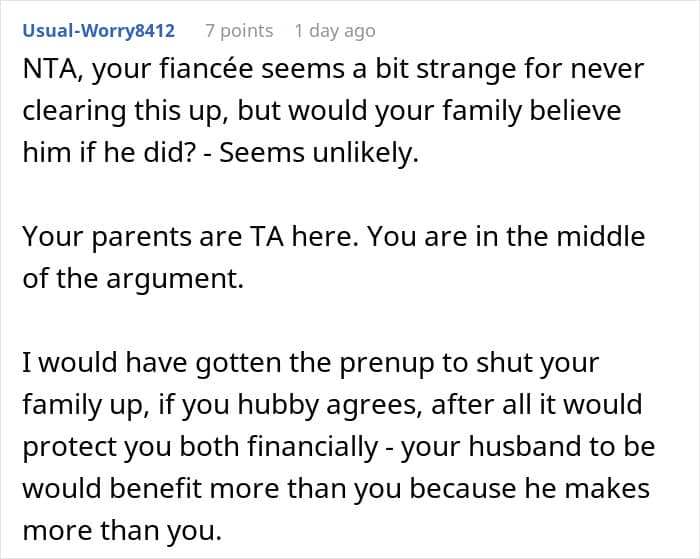 The reaction to the story was mixed. Many redditors reading the story weren’t impressed by the way that the OP handled the situation. Some thought that her fiancé would have defended himself if he had thought it important, so there was no need to step in on his behalf.