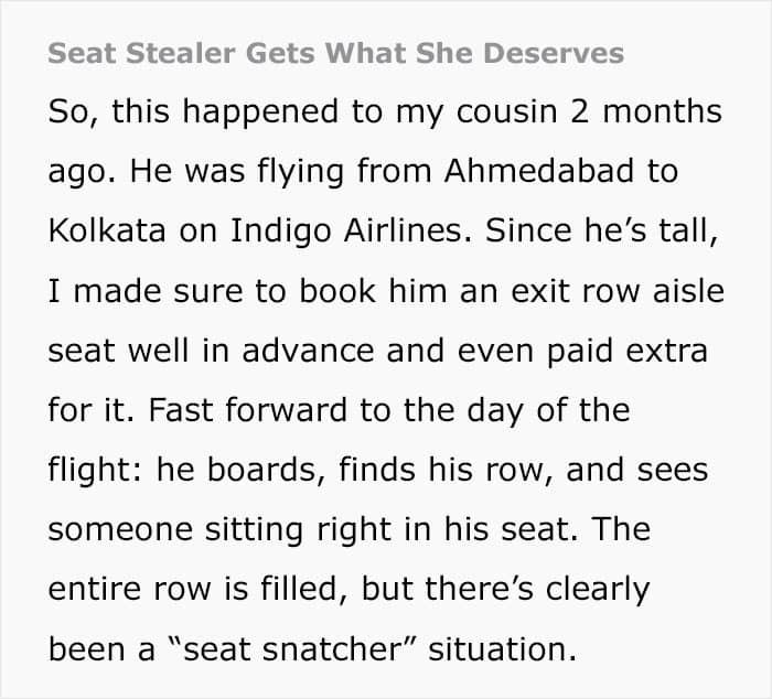 We have to admit—tricking the Karen into switching for a business class seat was a creative move. We asked the person who posted this story, u/compile_commit, whether their cousin thought of that on the spot or borrowed the idea from someone else.