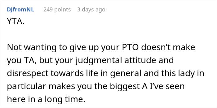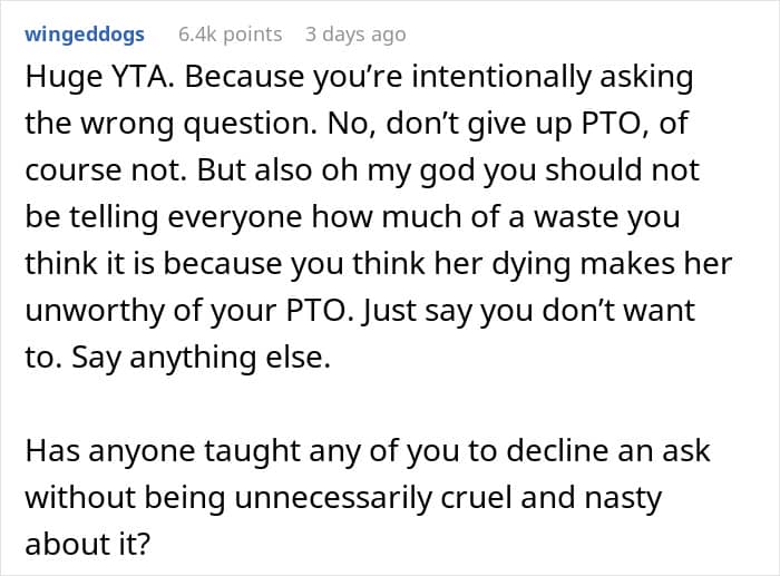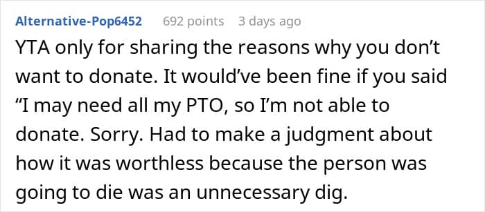 According to the author, their coworkers are all donating some of their paid time off to a colleague who has been diagnosed with cancer. All except for the OP who doesn’t see the point in ‘wasting’ the PTO. Now, they’re asking the internet whether they’re in the wrong for being so blunt. Scroll down for the story and to see the mixed reactions it got. We reached out to the author, and we’ll update the article as soon as we hear back from them.