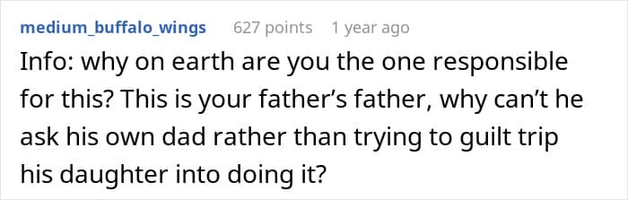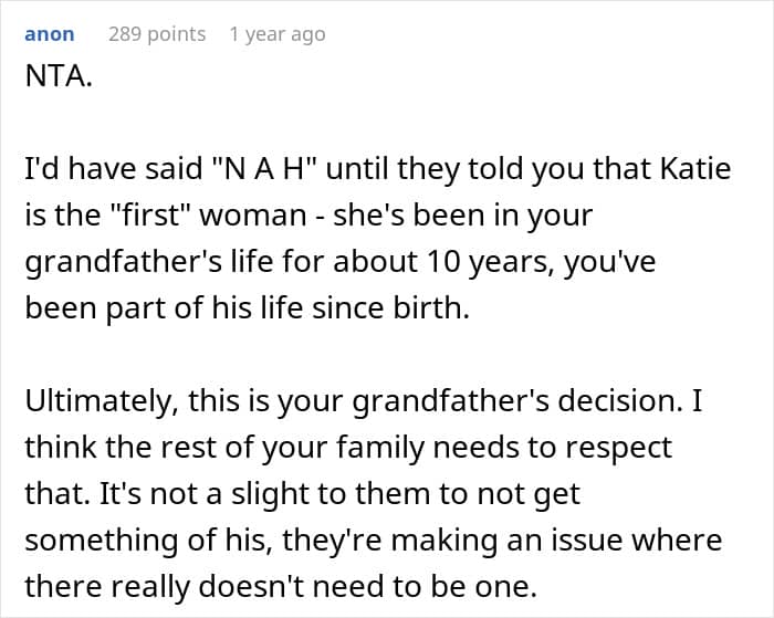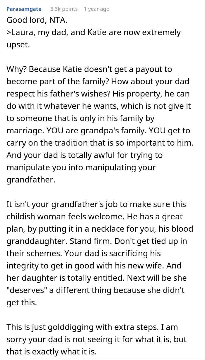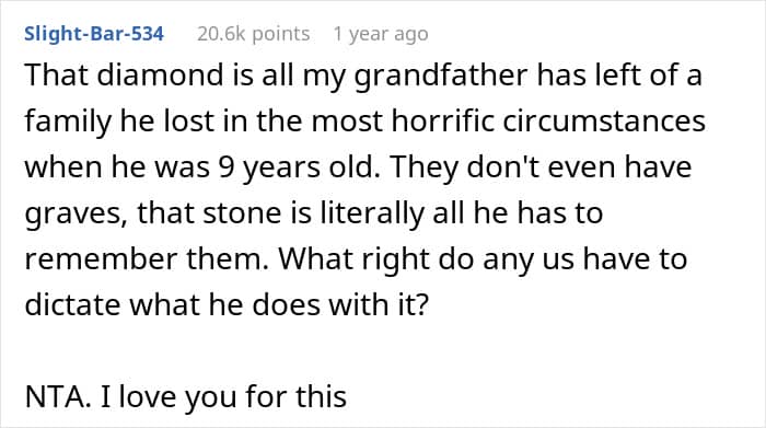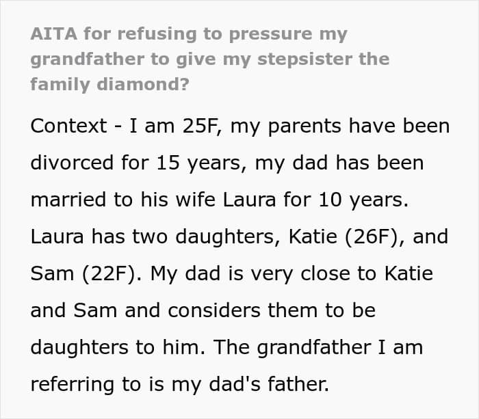 People in the comments say that the woman is not a jerk for not asking her grandpa to give her stepsister the diamond, and they should respect the fact that he wants to keep it in the family