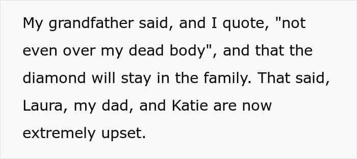 However, grandpa’s diamond had both a very high price tag and an emotional significance. So, he just wanted to make sure that his family’s legacy would live on through generations, by keeping it in the bloodline and not giving it to Katie.