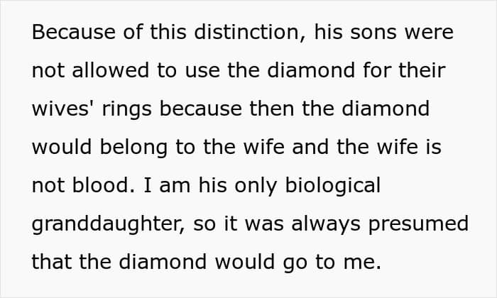 Grandpa won’t give his daughter’s stepsister his heirloom diamond for her engagement as she’s not “blood” related, but offers it to his granddaughter