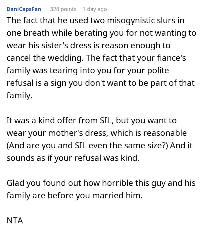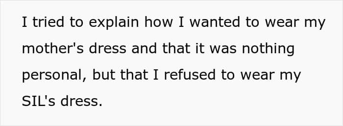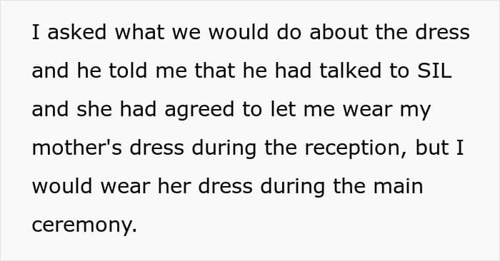 In her candid post, the woman explained that her future in-laws started insisting on the couple making changes to their wedding, and everything culminated in them pressuring her to wear another dress. One they had picked for her.