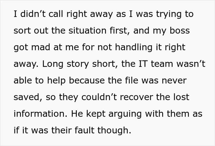 OP said she hadn’t called right away since she was trying to sort out the situation first, but her boss ended up reprimanding her, along with blaming the IT team. As it turns out, they couldn’t do anything anyway, since the file hadn’t been saved, something OP had shown her boss how to do countless times, to no avail.