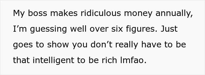 The woman concluded that her boss earns well over a six-figure salary, which just goes to show you can be rich without being that smart