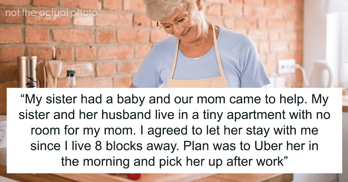 OP begins his story by telling the community that his sister just had a baby, so his mom is in town to help her out. He adds that his sister and her husband live in a tiny apartment, so his mom is staying with him, since he only lives 8 blocks away and has room to spare.