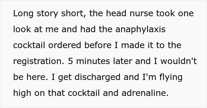 “We still have no idea what caused the anaphylaxis. My regular family doctor was shocked it happened because I am not prone to allergies in the first place. The only thing we can think of is maybe I came into contact with Morphin or similar residue while at the store. Someone broke their pill and didn’t wash their hands and I somehow came into contact. But that’s just a theory.”