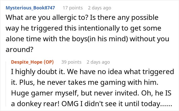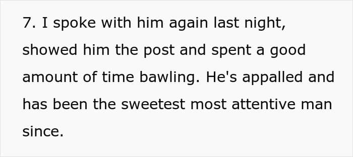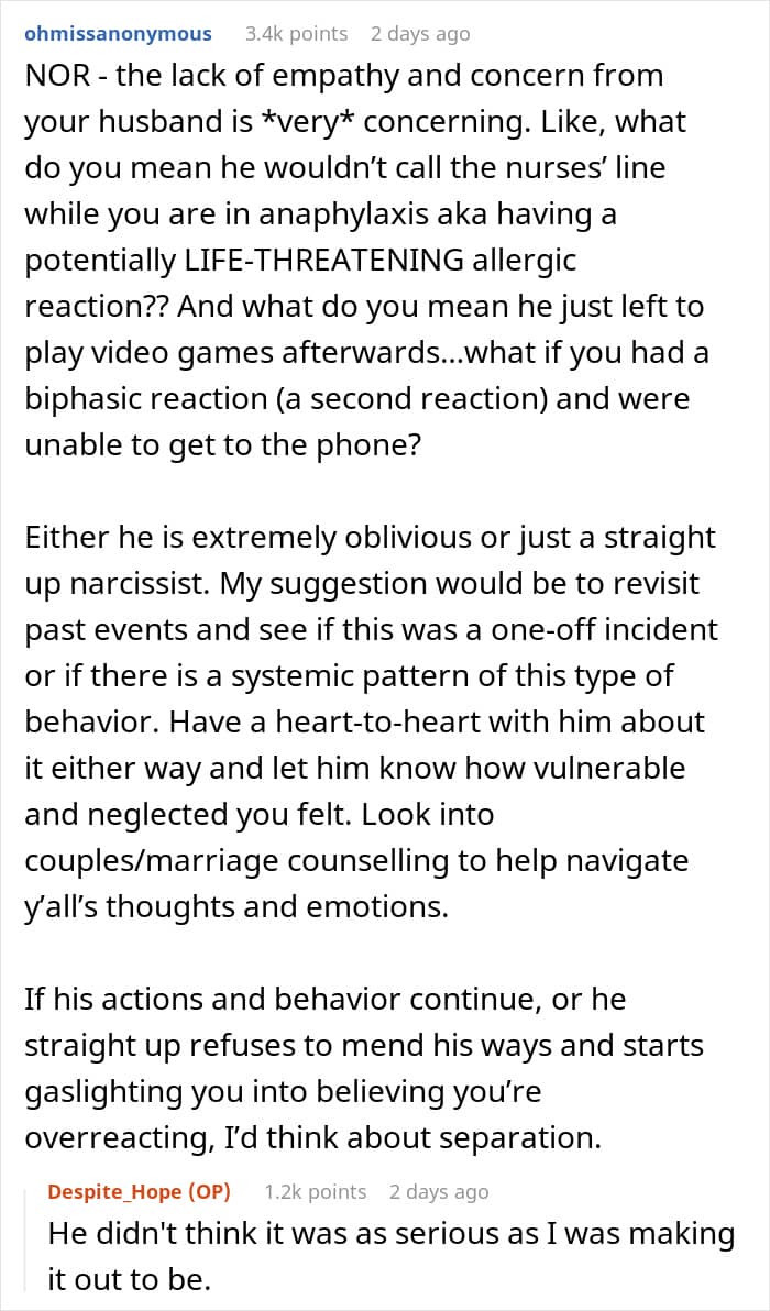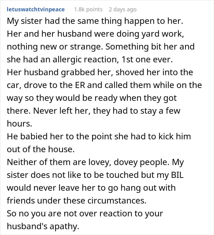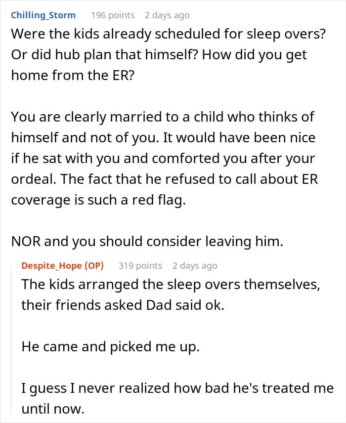 “After the post blew up I had a hard heart to heart with him. And we are trying to work through it. He didn’t understand how bad it was or how messed up it was to leave me alone after. We have agreed that if either of us end up in the ER, regardless of the reason, boys night is canceled. He’s been very attentive ever since, even cooking dinner the last couple of nights. And invited me to the next game night,” she added.
