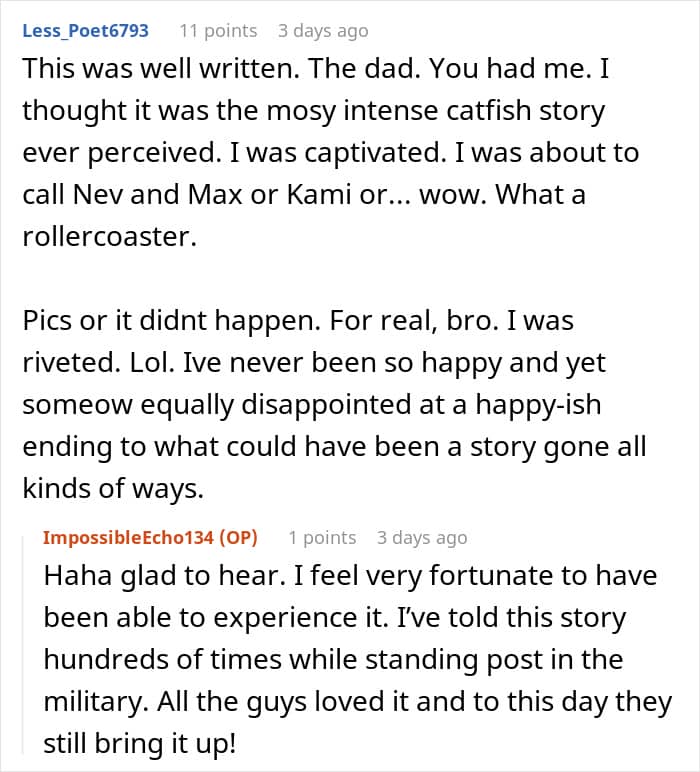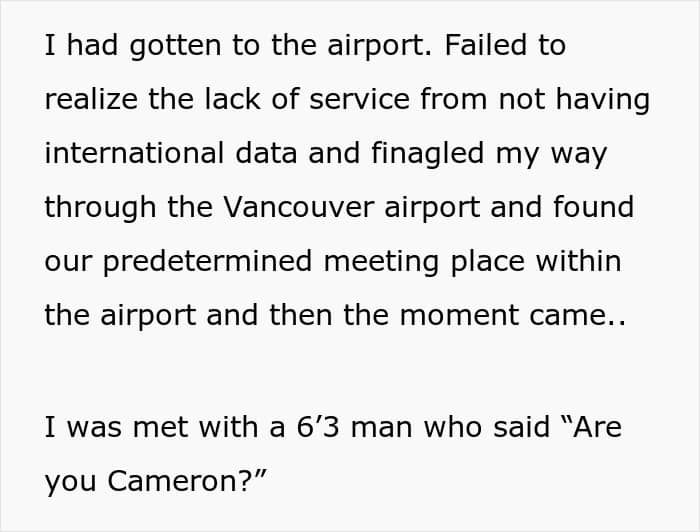 Fortunately, the man quickly followed up with “Nice to meet you, I’m her dad” and the girl he was supposed to meet was standing just nearby. Needless to say, when OP saw her, it was cinematic – he felt like the airport crowd had parted like the Red Sea so that they could meet.