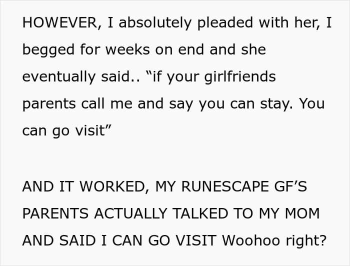 However, the plan didn’t work at first – the OP’s mom refused to let him go, but eventually, she caved in as the girl’s parent called her and said he could stay over if he came. So off he went!