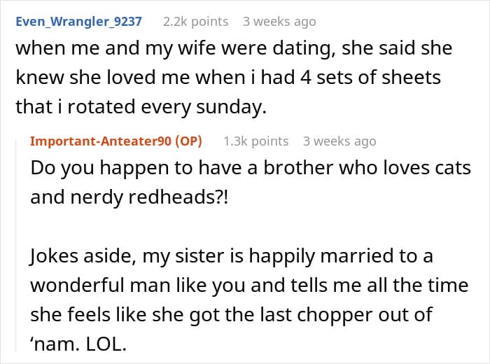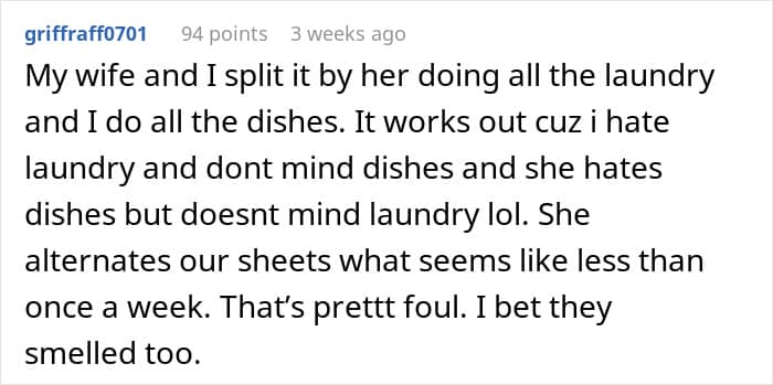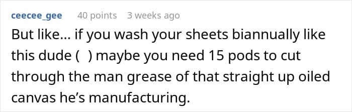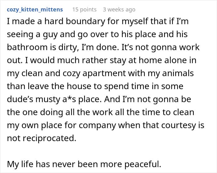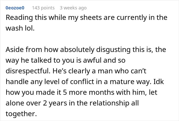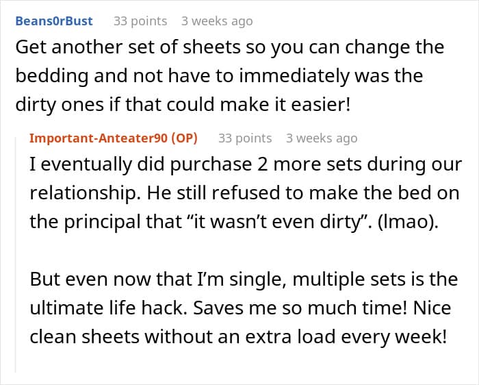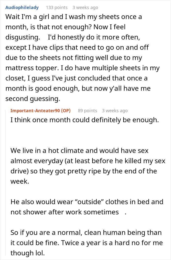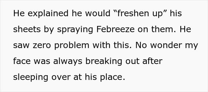“If we get into bed and feel relaxed, comfy and happy, that new bedding smell helps us to feel calm and happy,” she added. But judging from what the OP shared about her boyfriend’s personal hygiene habits, his bed didn’t seem like a place where she would feel calm or happy.