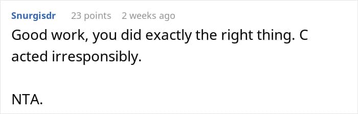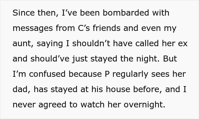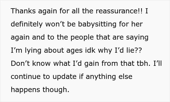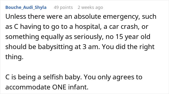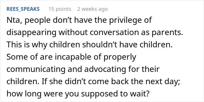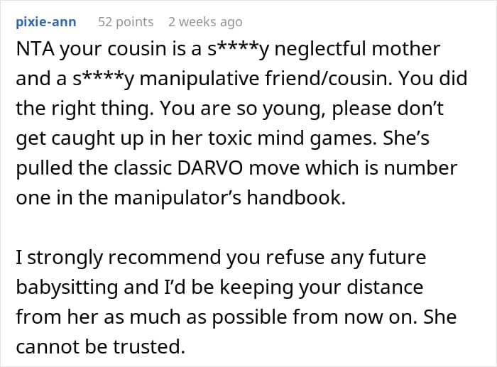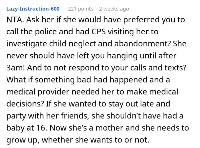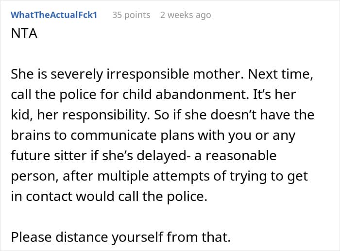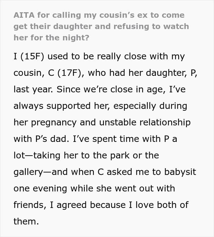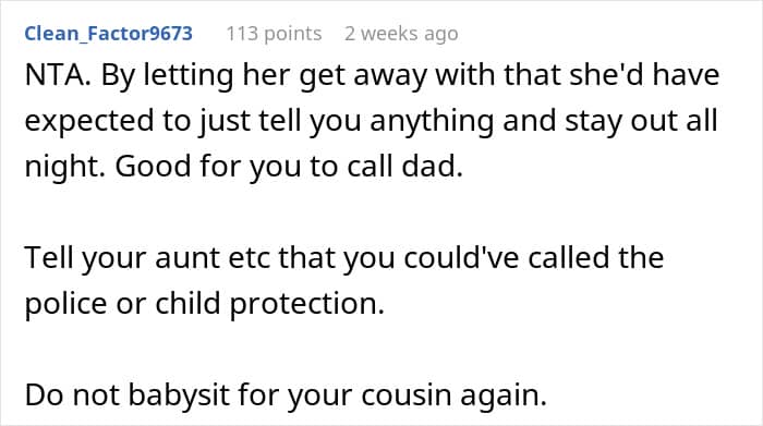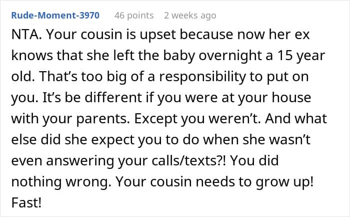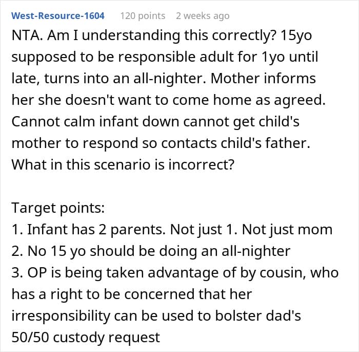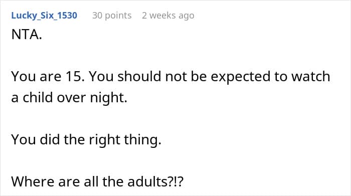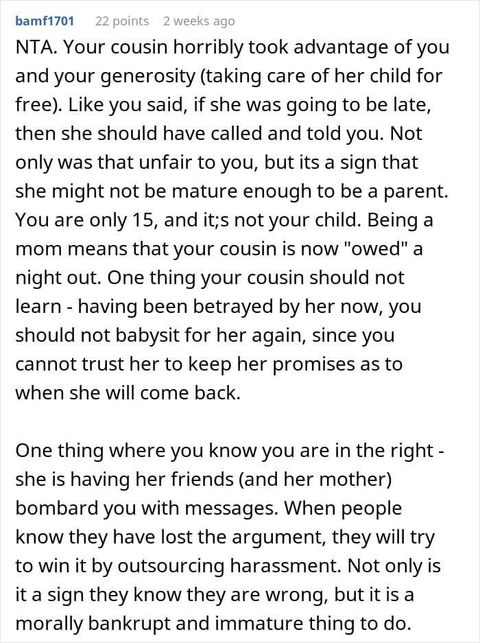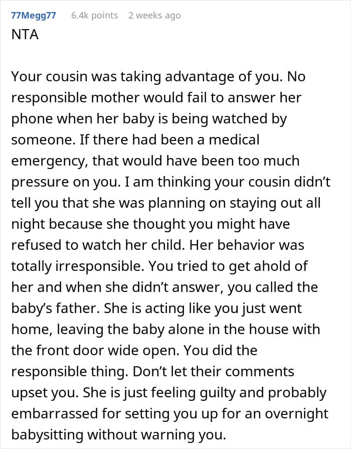 In fact, she probably didn’t tell the babysitter because knew that she would absolutely not agree to stay the night. It’s not to say that the mom doesn’t deserve a night out, but this is not the way to go about it. Even worse, the mom didn’t even follow up in the morning, she just assumed that a teenage girl could spend over twelve hours looking after a kid. Unfortunately, her friends and the cousin’s mom also seem to think she did the wrong thing, although we have to assume they only heard the cousin’s side of the story.