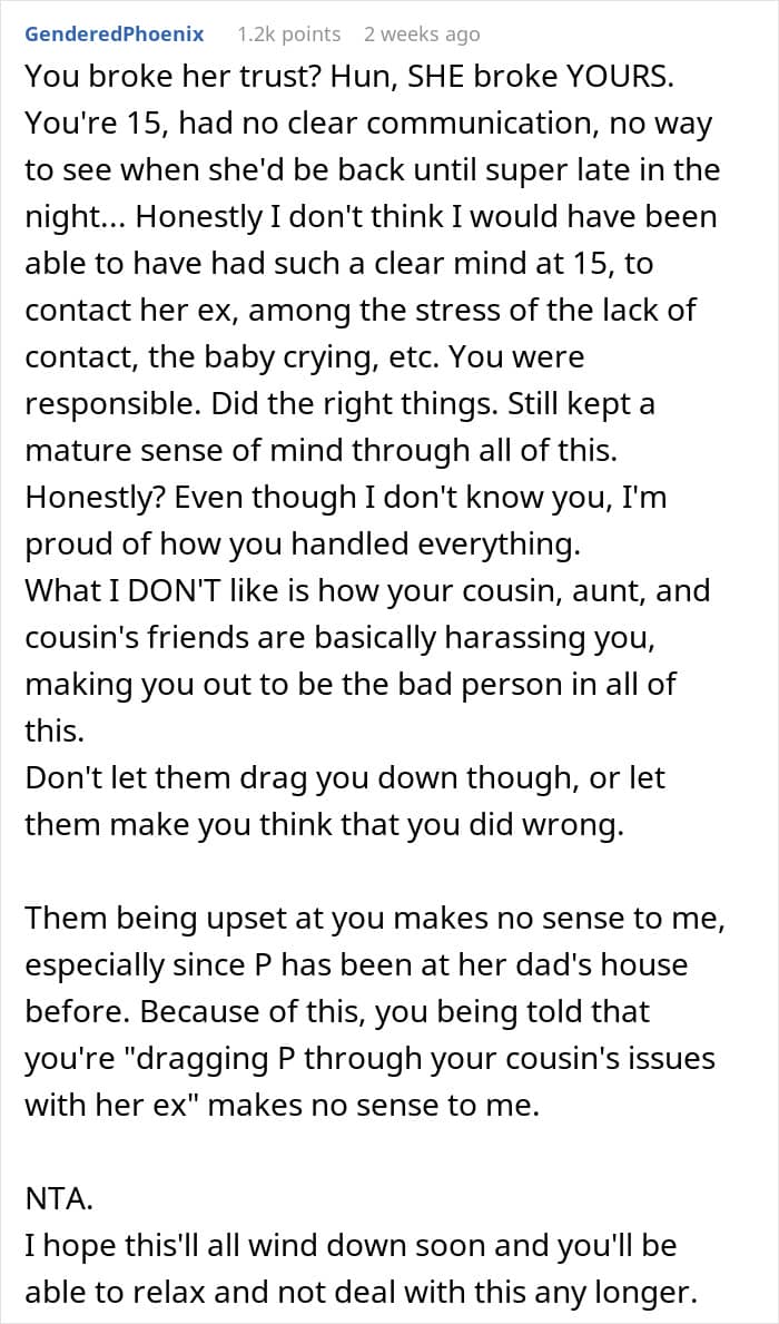 No matter how you spin it, leaving a fifteen year old with a baby overnight is just a downright terrible idea. Remember, a fifteen year old is a child, just like the baby, although in many ways significantly more capable. So there is almost no way her cousin, herself legally a minor, could berate her for her actions.