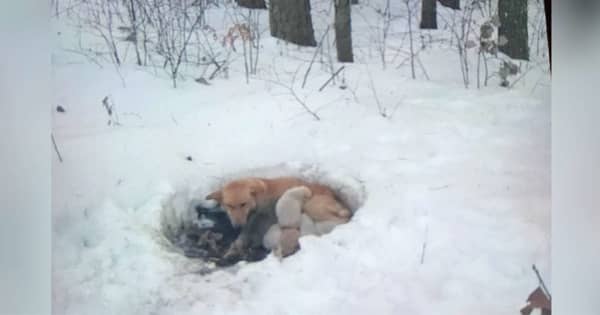 Mother Dog Protects 6 Puppies In Bl.izzard By Building A SnowHouse!