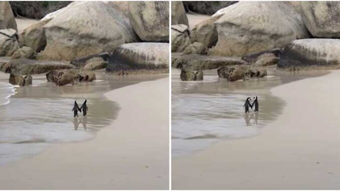 Penguin couple spotted romanticly holding hands while walking along the beach!